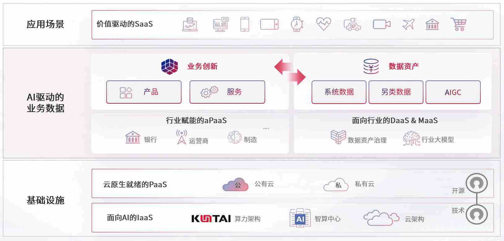 数字时代,,,,围绕企业数字化转型的关键要素,,,尊龙z6数码开创性的提出数云融合战略和技术体系框架,,,着力在云原生、、、、数字原生、、、AI原生和信创产业上架构产品和服务能力,,为处在不同数字化转型阶段的快消零售、、汽车、、金融、、医疗、、、政企、、、教育、、运营商等行业客户提供泛在的敏捷IT能力和融合的数据驱动能力,,,,构建跨界融合创新的数字业务场景和新业务模式,,,,助力企业级客户建立面向未来的核心能力和竞争优势,,,全面推动社会的数字化、、、智能化转型升级。。