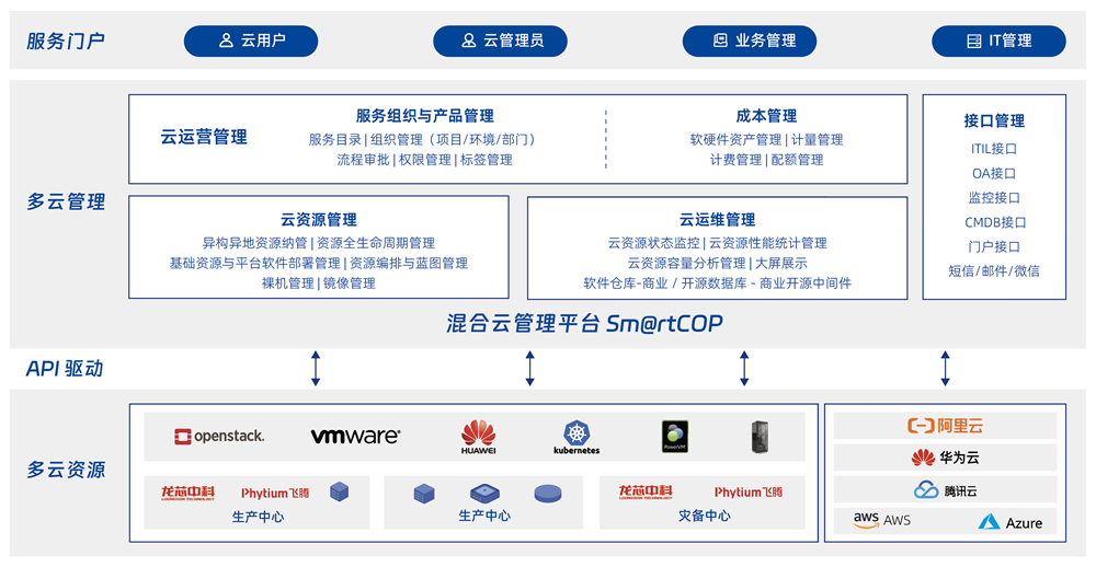 面向各行业用户多云资源管理、、、、运维及服务提供的综合挑战,,,提供异构异地异芯片多云资源的统一管理、、、统一运维、、、、统一监控及统一运营服务,,,,简化多云管理复杂度,,,提升用户用云满意度,,释放云平台业务价值。。。