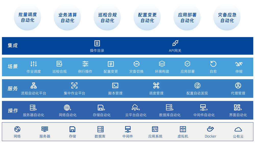 提供组织级全流程自动化运维,,可以把企业最佳的运维流程固化为模板,,,实现对任意数量 IT 资源的批量标准化执行,,完成配置变更、、数据收集、、、、环境构建、、故障自愈、、、资源调整、、、、应用部署、、自动巡检等场景的自动化,,,,显著提升日常运维工作的效率和可靠性,,,缩短操作时间、、、、降低运维操作的成本和操作风险。。。。