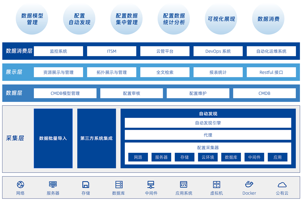 帮助用户建立统一的运维主数据,,,通过各种自动化手段实现以应用为核心的全面资源管理以及运维消费场景共享。。。。系统具备灵活的 CMDB 分层建模和配置信息维护机制,,可以提供面向业务的 IT 架构画像,,,为各个运维工具提供集中化的资源信息管理和协同,,为 IT 运维和 DevOps 体系下的各种运维场景提供数据消费服务。。。。