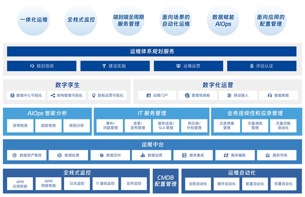 针对数字化时代对运维管理的需求,,自主研发的“监管控析”一体化智能运维解决方案。。。。平台以客户和业务场景为导向,,,通过全业务的数据和流程整合,,,同时支持传统 IT 架构和云技术架构的“双态 IT”运维,,,实现可视化、、场景化、、、自动化、、、精细化的智能运营管理,,提升用户体验及运营效率,,,,助力内外部生态的数字协同和价值创造。。。