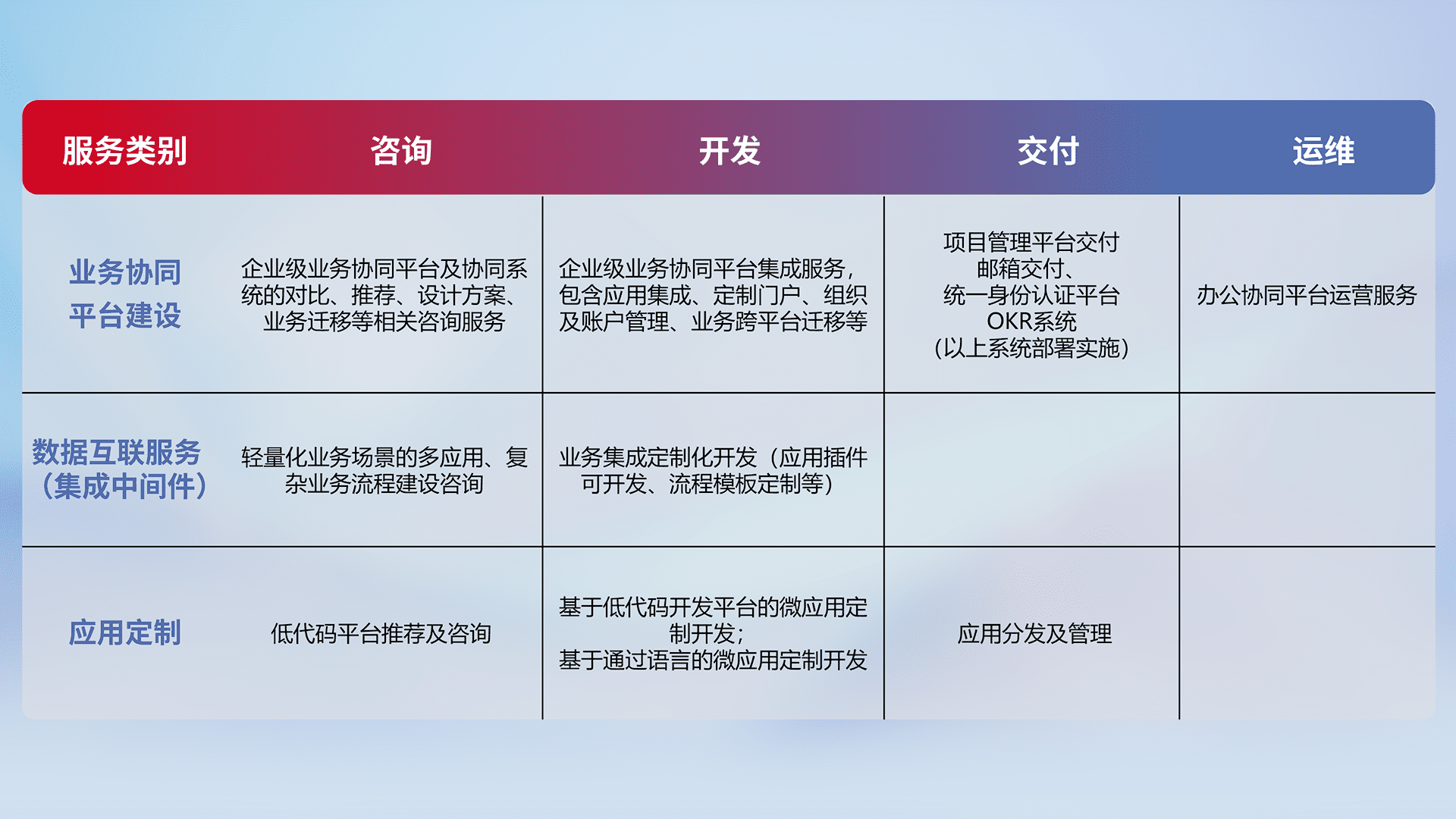 针对钉钉、、企微、、IDaas等平台级产品提供产品的规划、、、方案、、、、交付、、定制化开发等服务,,,实现如统一协同办公、、智能客户服务、、、、混合会议管理、、、、智能数据查询、、、等业务场景,,实现数字化转型。。