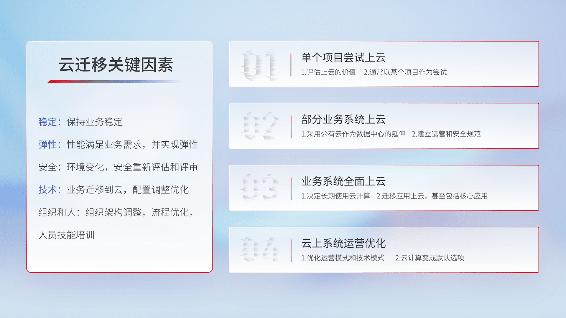 结合实际业务,,从规划设计、、云平台选型、、云原生改造、、、、数据迁移、、集成交付,,,,迁移全过程为客户识别最佳上云路径,,,做好风险识别管理,,设计网络架构、、、身份权限、、、安全审计合规、、、操作审计、、日志审计、、、、监控告警策略、、、、多站点容灾设计等,,对云上基础设施进行整体规划,,提升IT治理水平,,,以满足弹性、、、高可用、、、、高性能的需求。。。