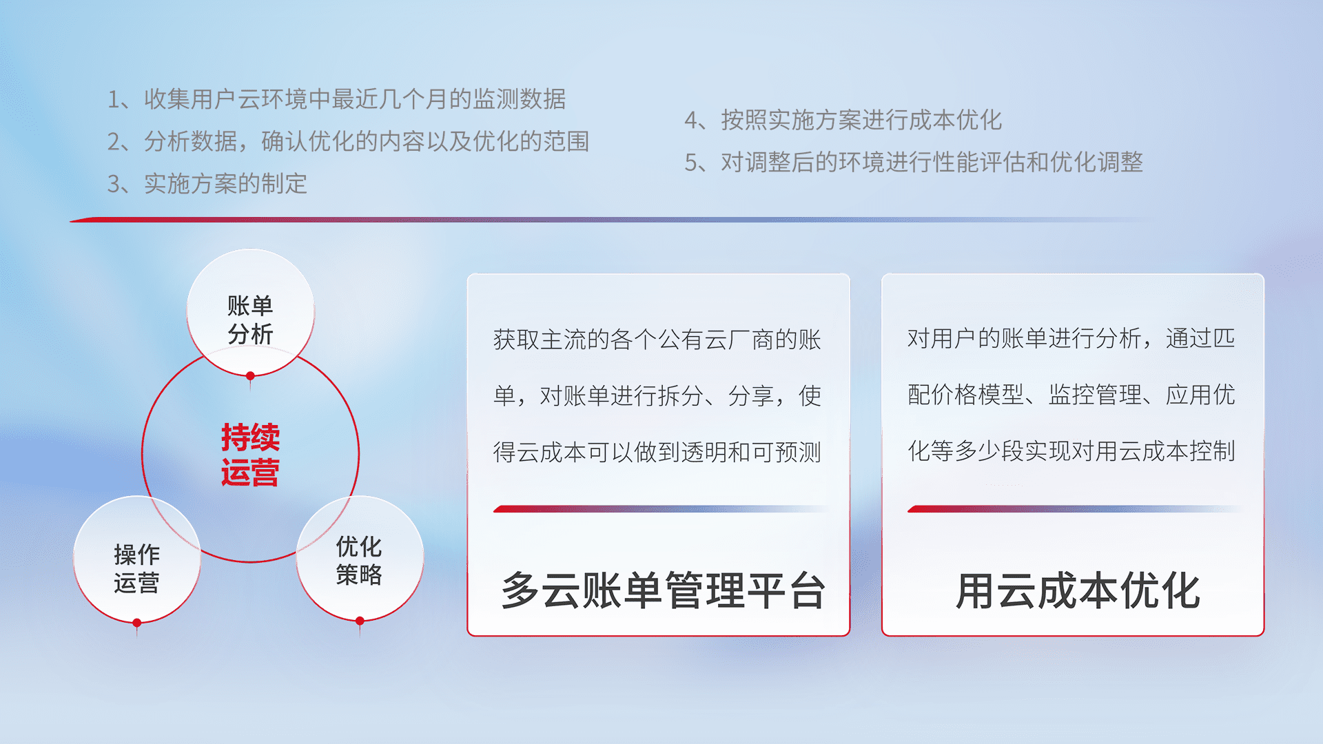 通过多云纳管,,以统一的资源数据模型把客户的云资源进行抽象和封装,,,,进而实现对多云资源的统一操作,,保障云资源管理的可靠性、、、稳定性与可用性。。量身定制化运维内容,,,配置、、、、开发运维、、补丁管理、、、备份、、、监控、、、认证和访问管理、、审计和日常巡检等,,保障在用云过程中的可靠度,,,,稳定度以及高可用率。。