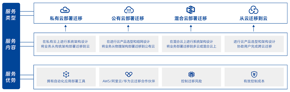 提供业务上云及云间迁移的端到端服务,,,,评估业务系统现状,,规划设计迁移架构、、、迁移技术和迁移方案,,,应用及数据上云迁移实施,,云上系统部署,,,,云上数据及业务验证,,,迁移后运维保障及持续优化服务。。。。