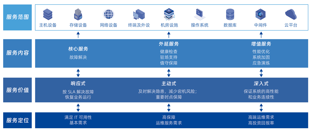 硬件维保(MA)服务:提供主机、、、、存储、、、、网络、、、、终端及外设、、、、机房设施等硬件设备故障解决、、、健康检查、、驻场支持、、、、值守保障、、、、系统升级加固、、、应急演练等服务。。软件维保(MA)服务:提供操作系统、、、数据库、、、、中间件、、存储软件等软件产品故障解决、、、、健康检查、、、、性能优化、、系统升级等服务。。。